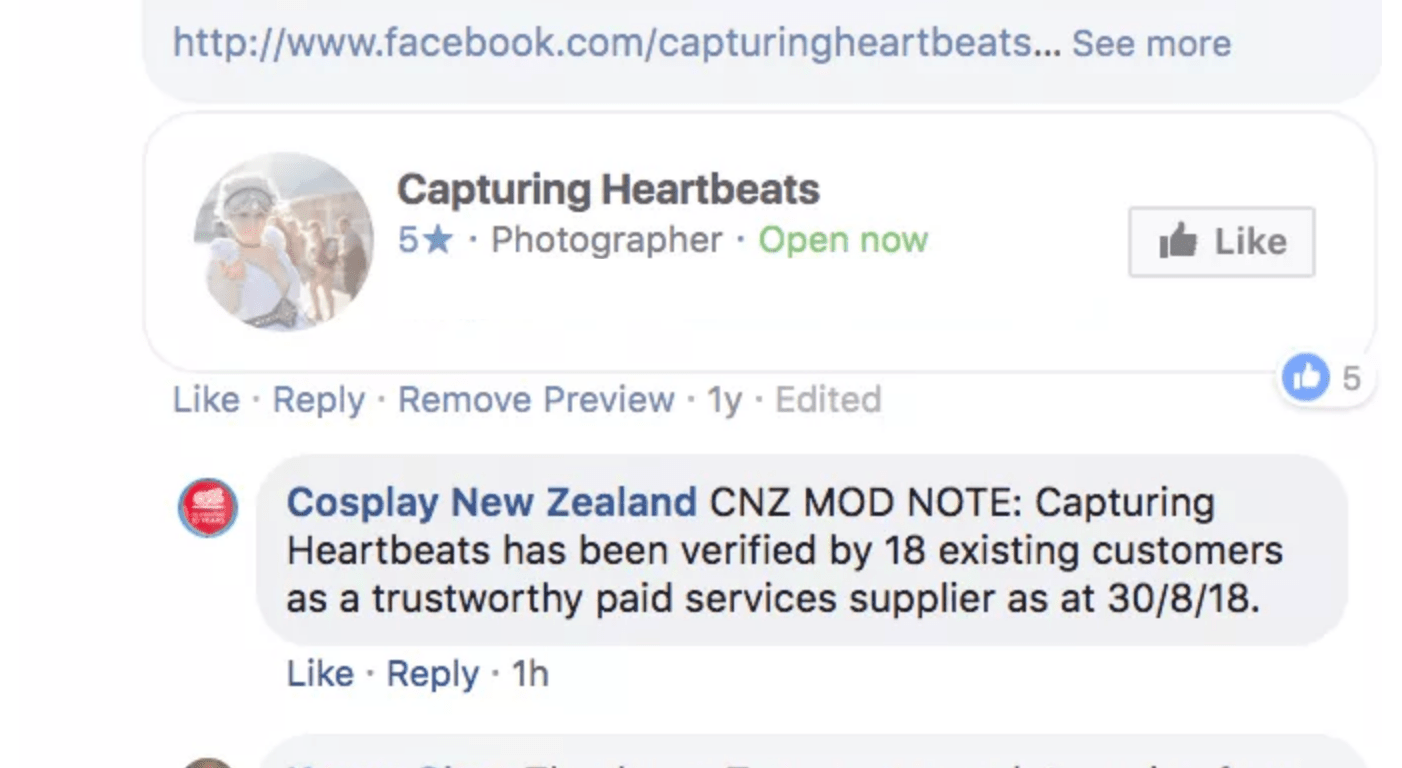 Here’s a note saying I have been Verified by Cosplay New Zealand group as a recognised supplier. 18 people from the Cosplay community have put up their hands saying I can do a good job by me telling them how to shift their weight and me pressing a button.